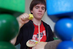 Bild: Nick Tschirner trainiert seine nach einem Verkehrsunfall nur eingeschränkt bewegliche rechte Hand nach dem "Taubschen Bewegungstraining".Foto: Jan-Peter Kasper/ FSU