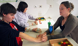 Bild: Die Physiotherapeutin Eva Miltner (r.) trainiert im Universitätsklinikum Jena mit Nick Tschirner und Christine Kohblanck, um deren feinmotorische Bewegungsabläufe ihrer Hände nach einem Schlaganfall zu verbessern.
